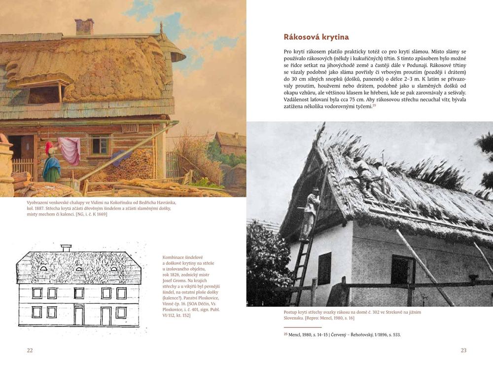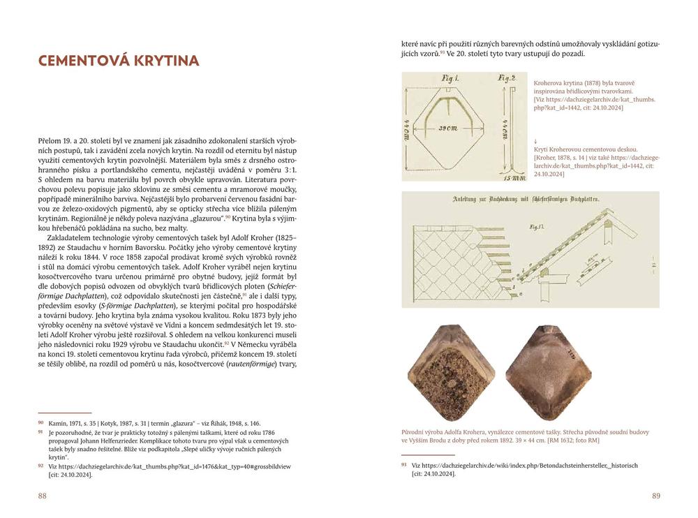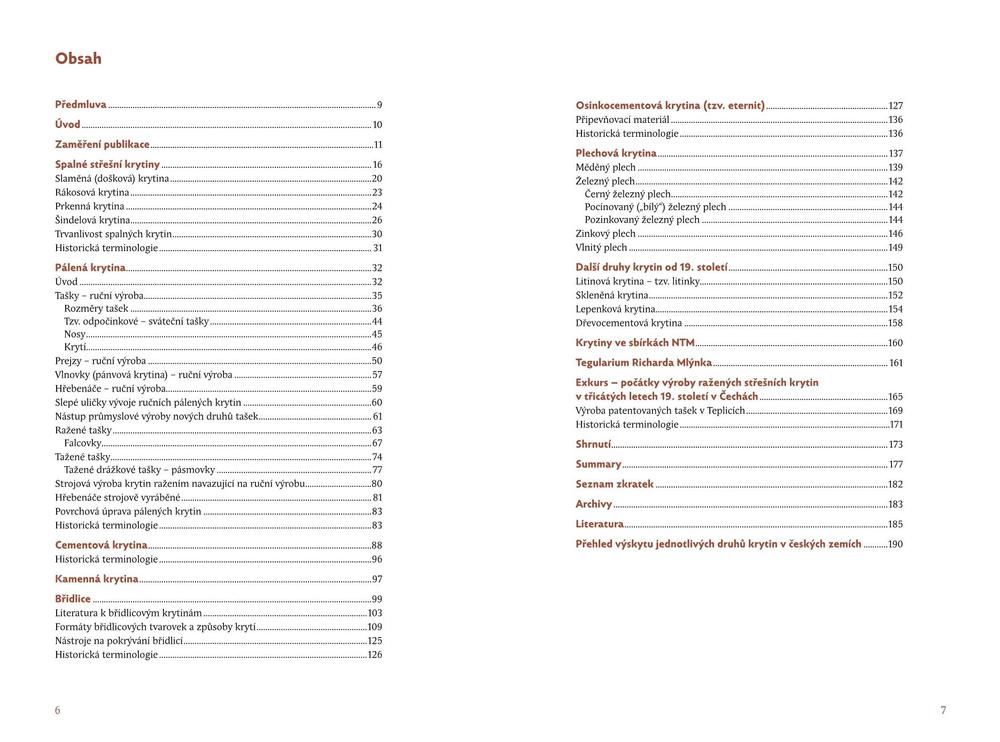 Kniha obsahuje texty o spalných střešních krytinách (především došcích a šindelu) i o jejich úpravách k zamezení hořlavosti. Nejpodstatnější část knihy je věnována jednotlivým typům pálených krytin včetně odlišení ruční i strojové výroby. K nim náleží především prejzové a ploché taškové krytiny, pro období strojové výroby navíc ražené a tažené tašky. Tvarově na pálenou krytinu navazovala krytina cementová. Lokálně významná a typově velmi komplikovaná byla břidlicová krytina. Svébytnou uzavřenou kapitolou s jasnou terminologií byla osinkocementová krytina. Knihu doplňují stati i o ostatních typech krytin – plechových, litinových, skleněných i levných náhražkách druhé poloviny 19. a počátku 20. století i o dalších souvislostech.