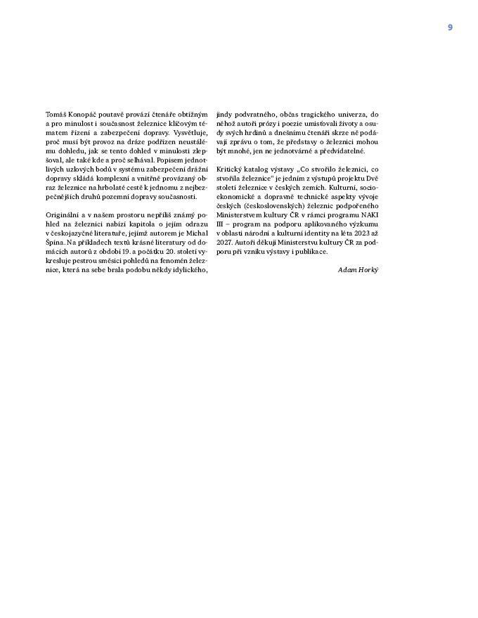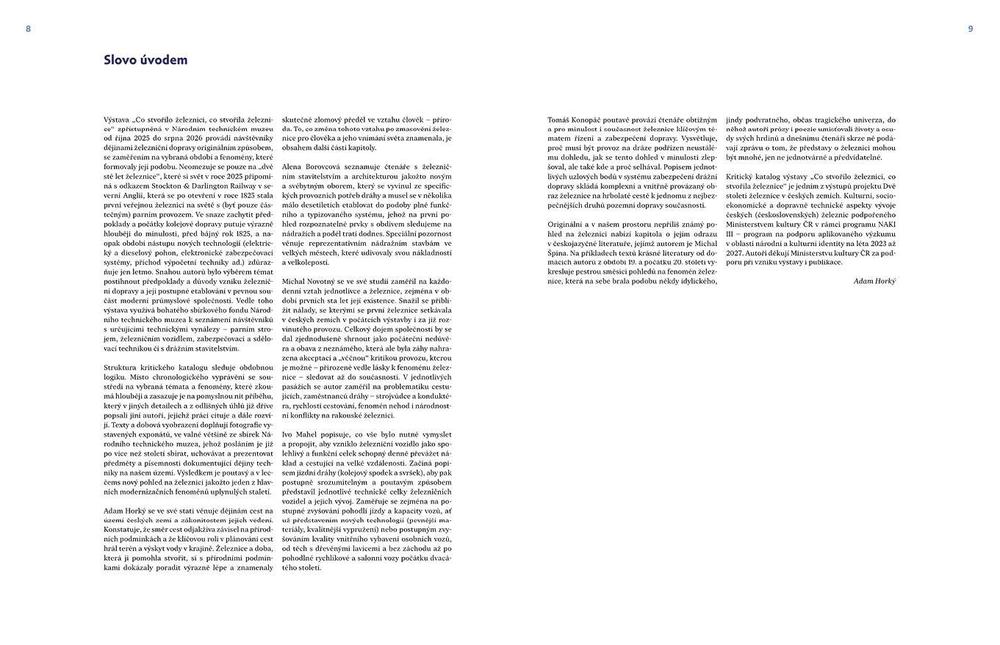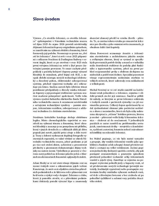 Katalog k Výstavě „Co stvořilo železnici, co stvořila železnice“ zpřístupněné v Národním technickém muzeu od října 2025 do srpna 2026 provádí návštěvníky dějinami železniční dopravy originálním způsobem, se zaměřením na vybraná období a fenomény, které formovaly její podobu. Neomezuje se pouze na „dvě stě let železnice“, které si svět v roce 2025 připomíná s odkazem Stockton & Darlington Railway v severní Anglii, která se po otevření v roce 1825 stala první veřejnou železnicí na světě s (byť pouze částečným) parním provozem. Ani oněch dvě stě let ostatně výstava nepojímá důsledně chronologickým a vyčerpávajícím způsobem. Ve snaze zachytit předpoklady a počátky kolejové dopravy putuje výrazně hlouběji do minulosti, před bájný rok 1825, a období nástupu nových technologií (elektrický a dieselový pohon, elektronické zabezpečovací systémy, příchod výpočetní techniky ad.) zdůrazňuje jen letmo.