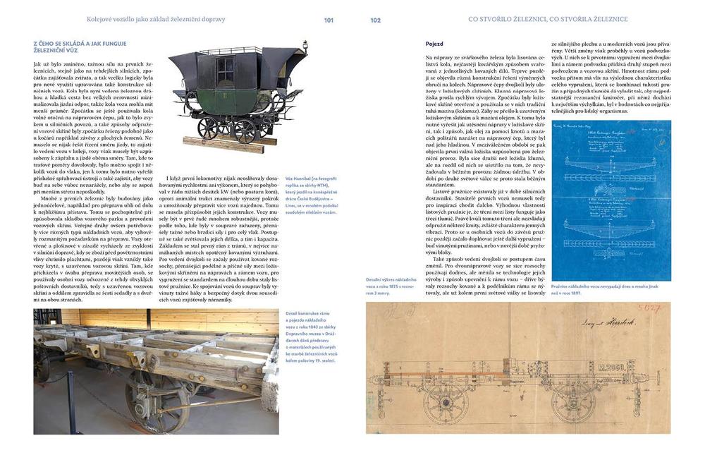 Ivo Mahel popisuje, co vše bylo nutné vymyslet a propojit, aby vzniklo železniční vozidlo jako spolehlivý a funkční celek schopný denně převážet materiál a cestující na velké vzdálenosti. Začíná popisem jízdní dráhy (kolejový spodek a svršek), aby pak postupně srozumitelným a poutavým způsobem představil jednotlivé technické celky železničních vozidel a jejich vývoj. Zaměřuje se zejména na postupné zvyšování pohodlí jízdy a kapacity vozů, ať už představením nových technologií (pevnější materiály, kvalitnější vypružení), nebo postupným zvyšováním kvality vnitřního vybavení osobních vozů, od těch s dřevěnými lavicemi a bez záchodu až po pohodlné rychlíkové a salonní vozy počátku dvacátého století.